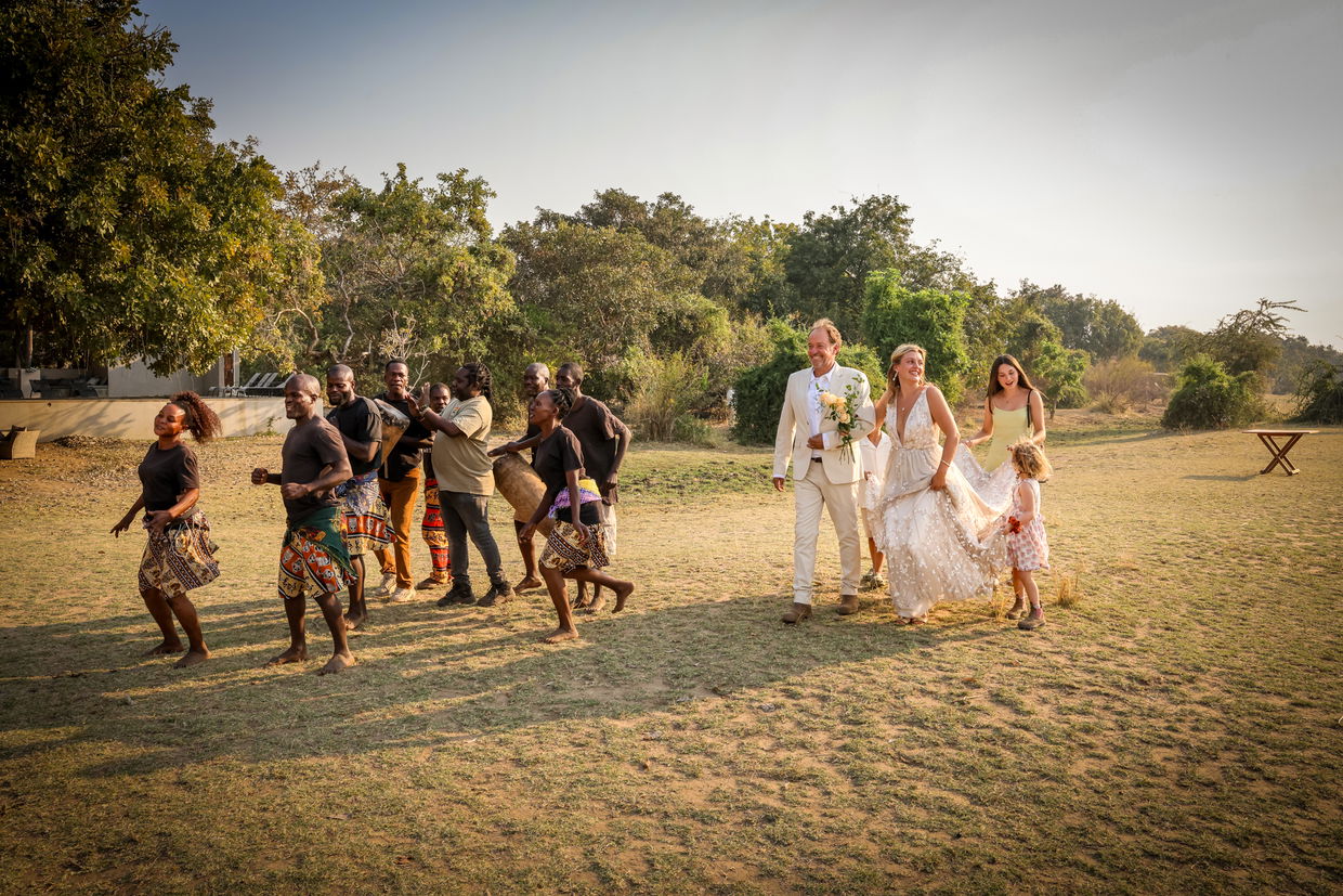 At 16:00 the wedding begins with movement and music. The bride and dad walk in behind the vibrant SECA band, who dance and drum their way towards the riverbank. It’s joyful, colourful, and full of life—exactly the spirit of South Luangwa.