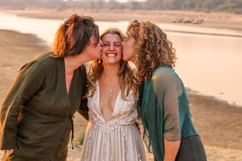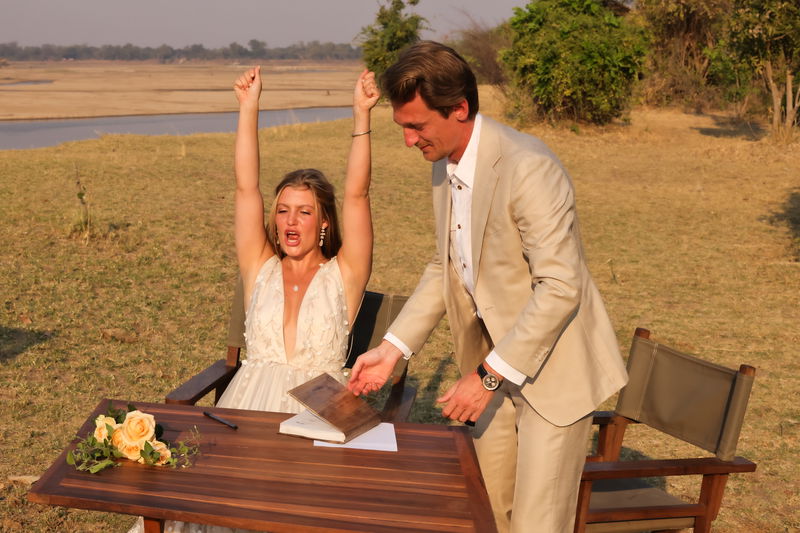 The ceremony itself is unforgettable. Vows are exchanged right at the edge of the river, while baboons play on the sandbanks behind the couple. The light is soft, the breeze gentle, and every guest feels how special this moment is.