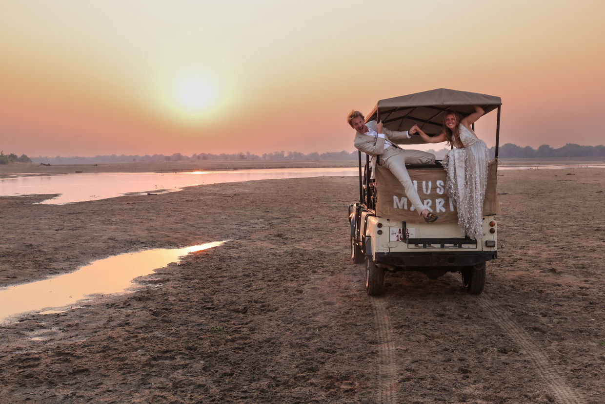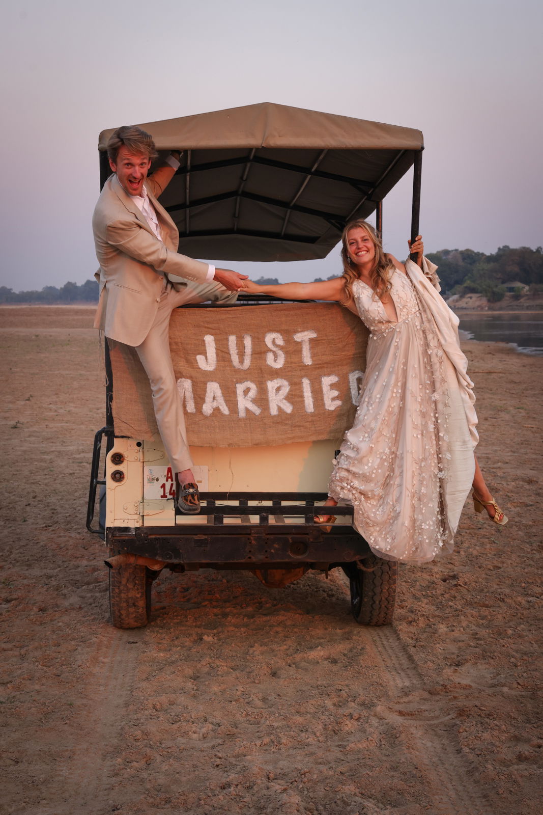 The bride and groom then step into a vehicle for a short gamedrive photoshoot—complete with a river crossing—capturing those wild and intimate safari wedding moments.