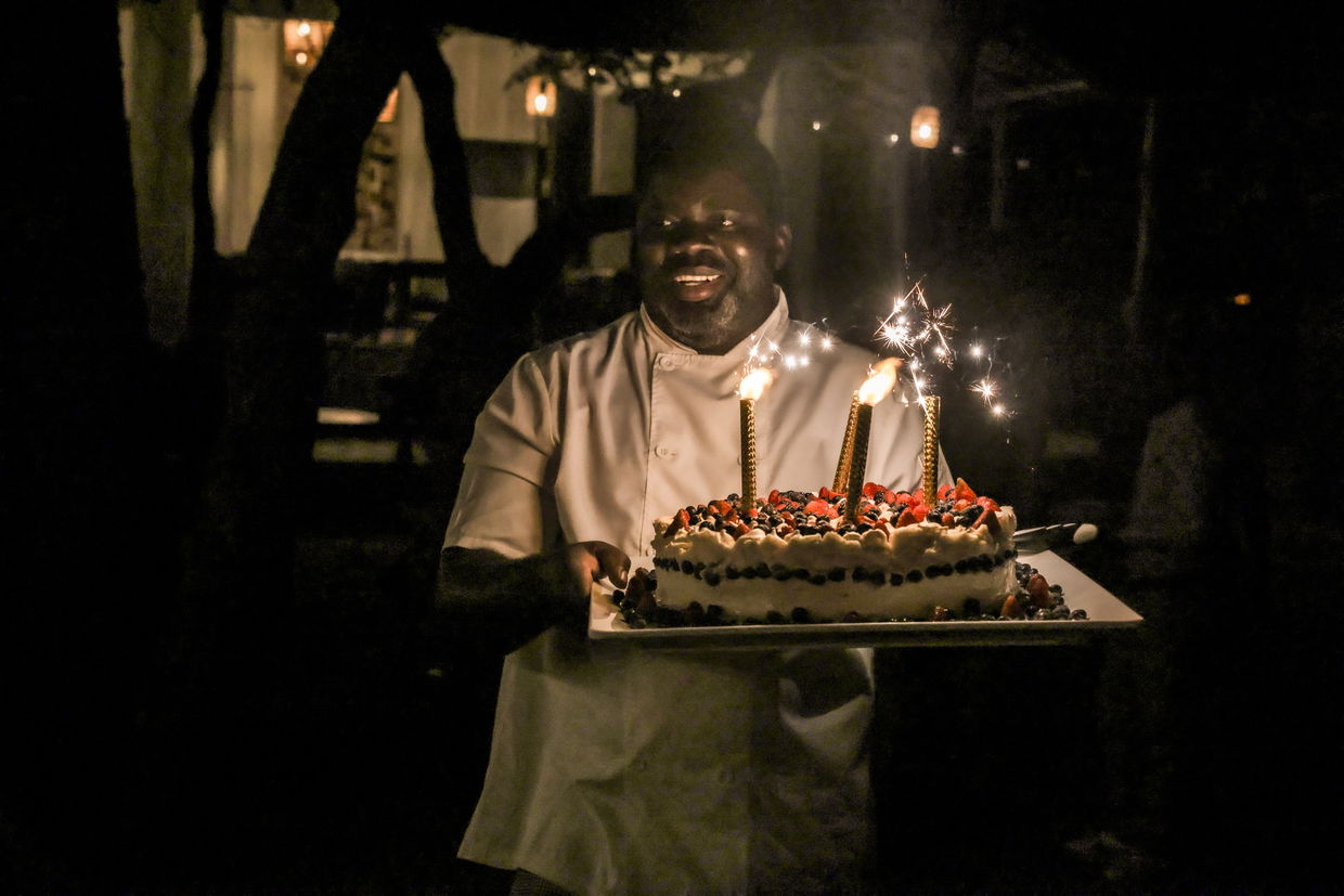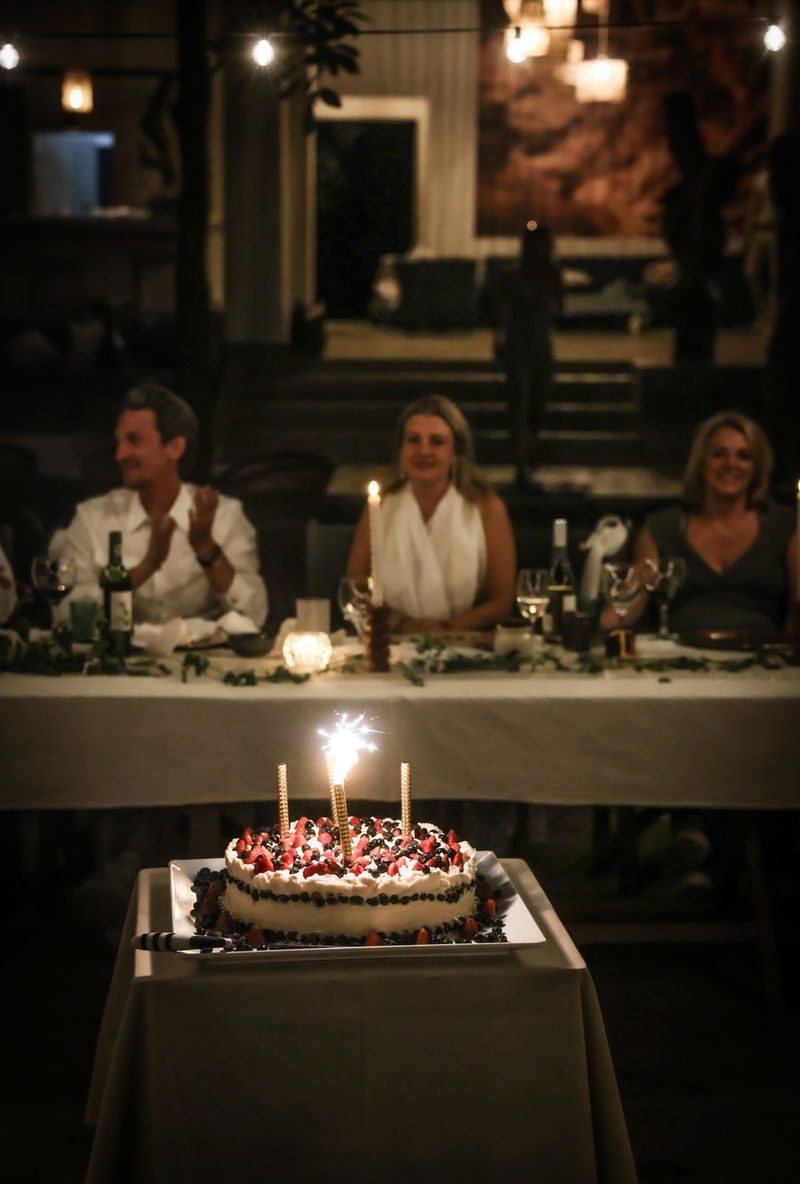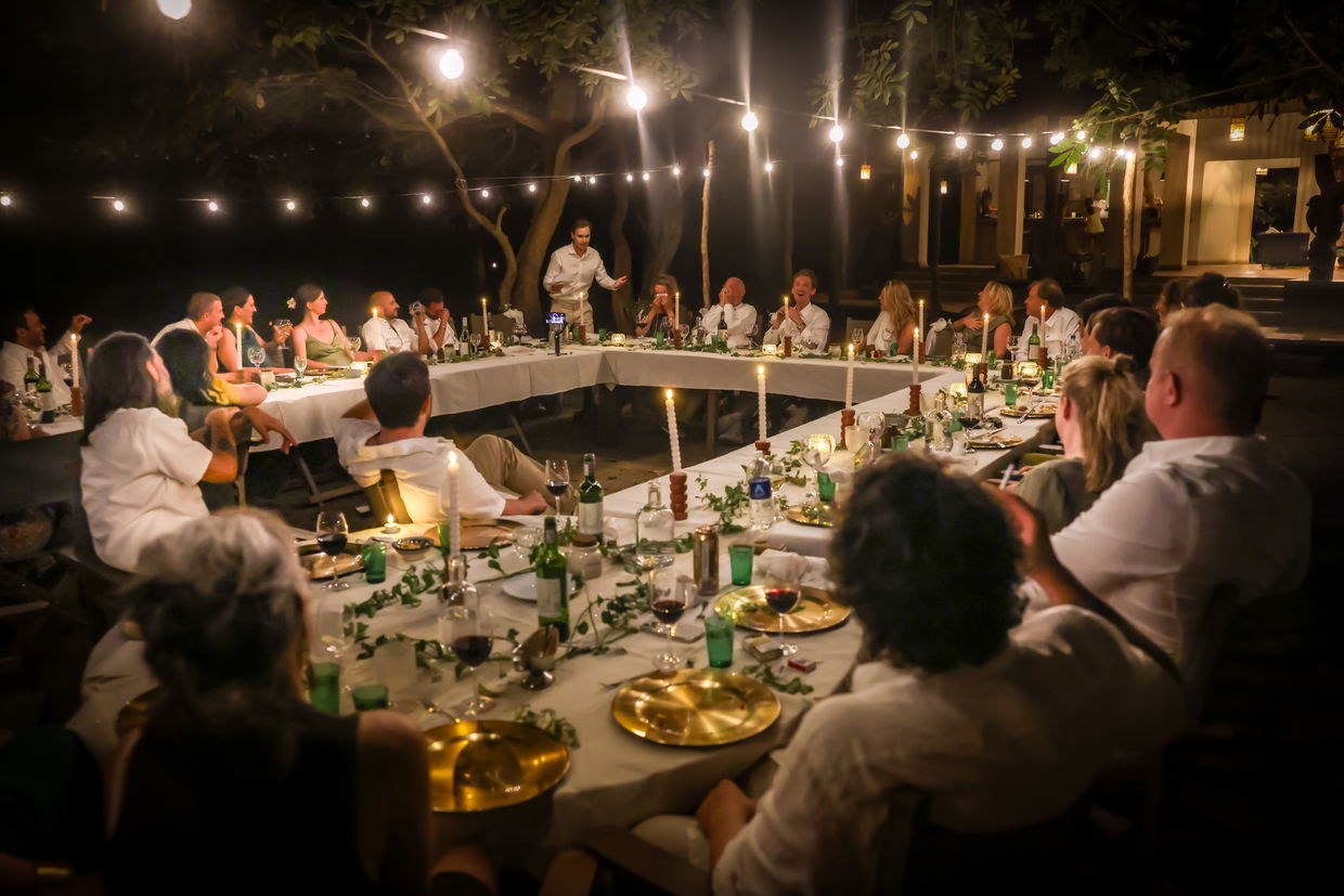 Dinner is served at a beautifully arranged U-shaped table covered in white tablecloths, golden plates, glowing candles, and warm lights. Chef Douglas and his team prepare a wonderful meal, and with every course there are heartfelt speeches, toasts, and stories.